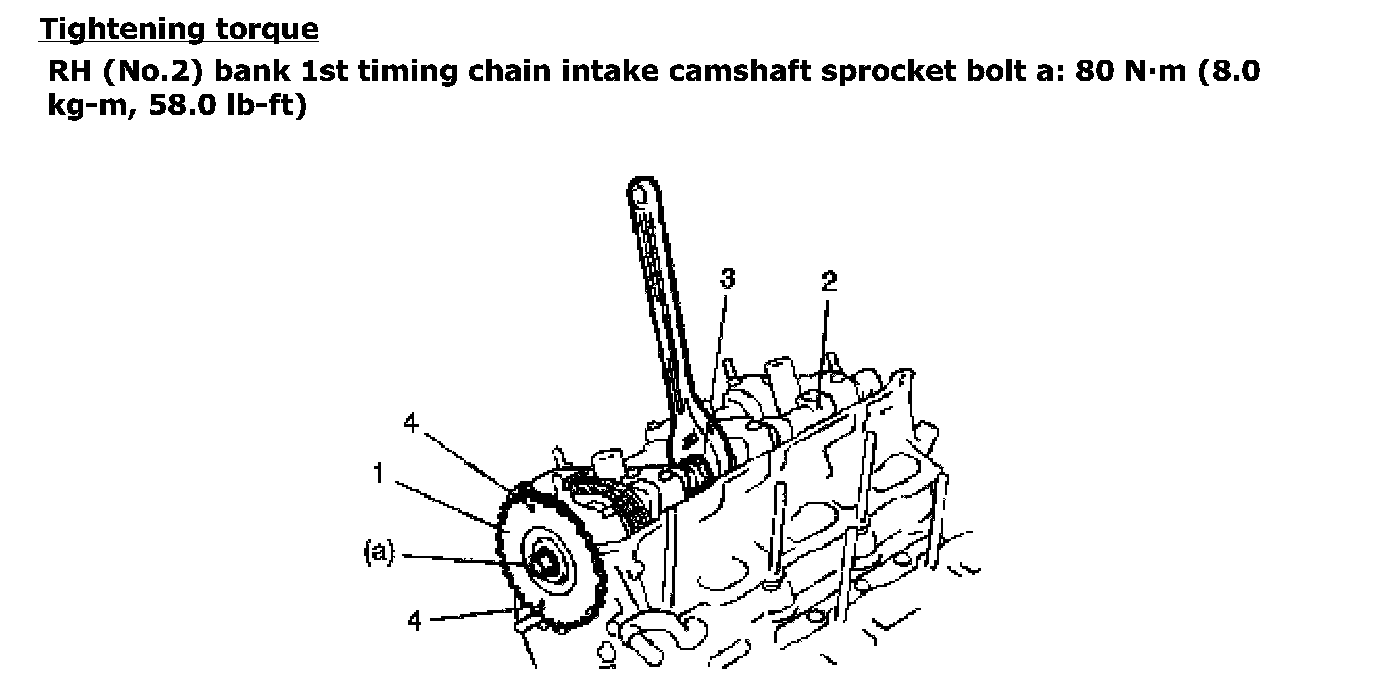 ^ Install RH (No.2) bank 1st timing chain intake camshaft sprocket (1) noting the following points.