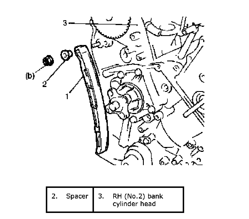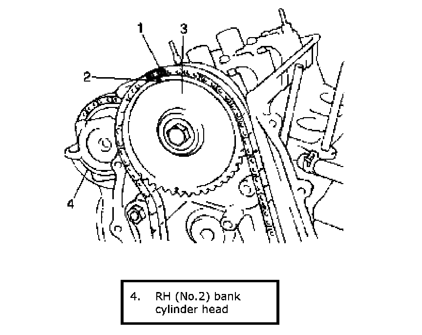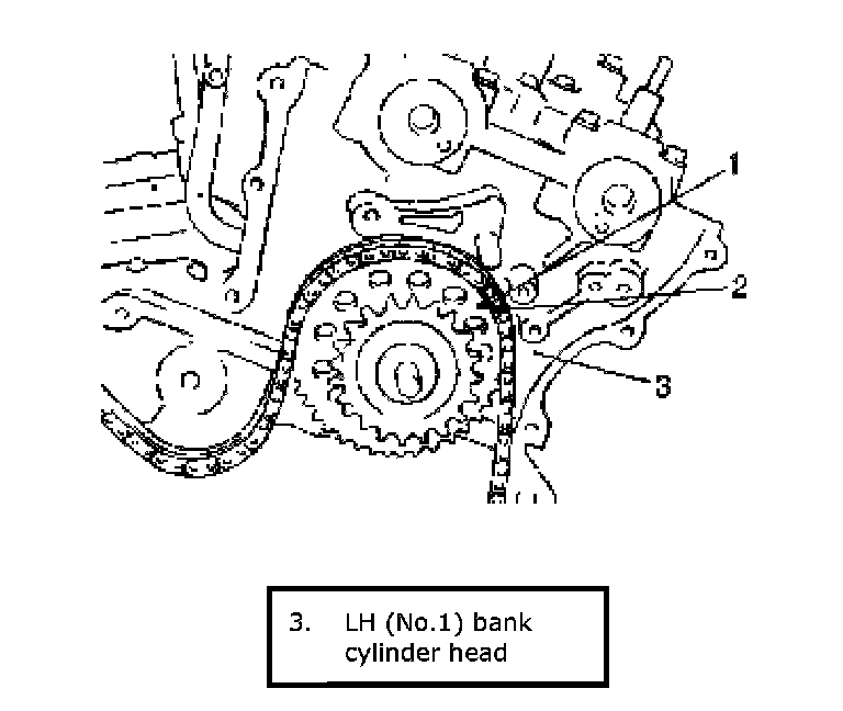 ^ Install 1st timing chain by aligning match marks (2) on RH silver plate (1) of 1st timing chain and RH (No.2) bank 1st timing chain intake camshaft sprocket (3).