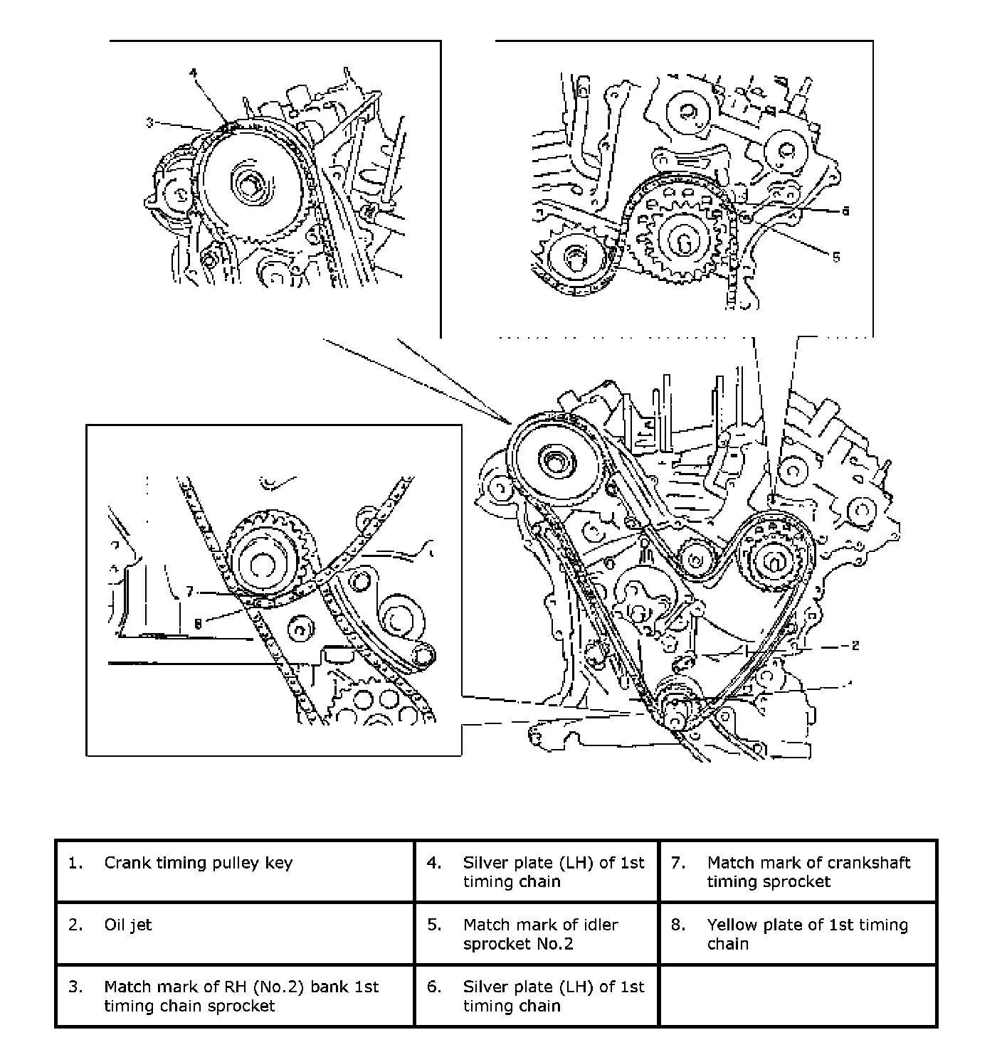 ^ For reinstallation of timing chain, align 8 timing marks as shown in figure by turning crankshaft.
