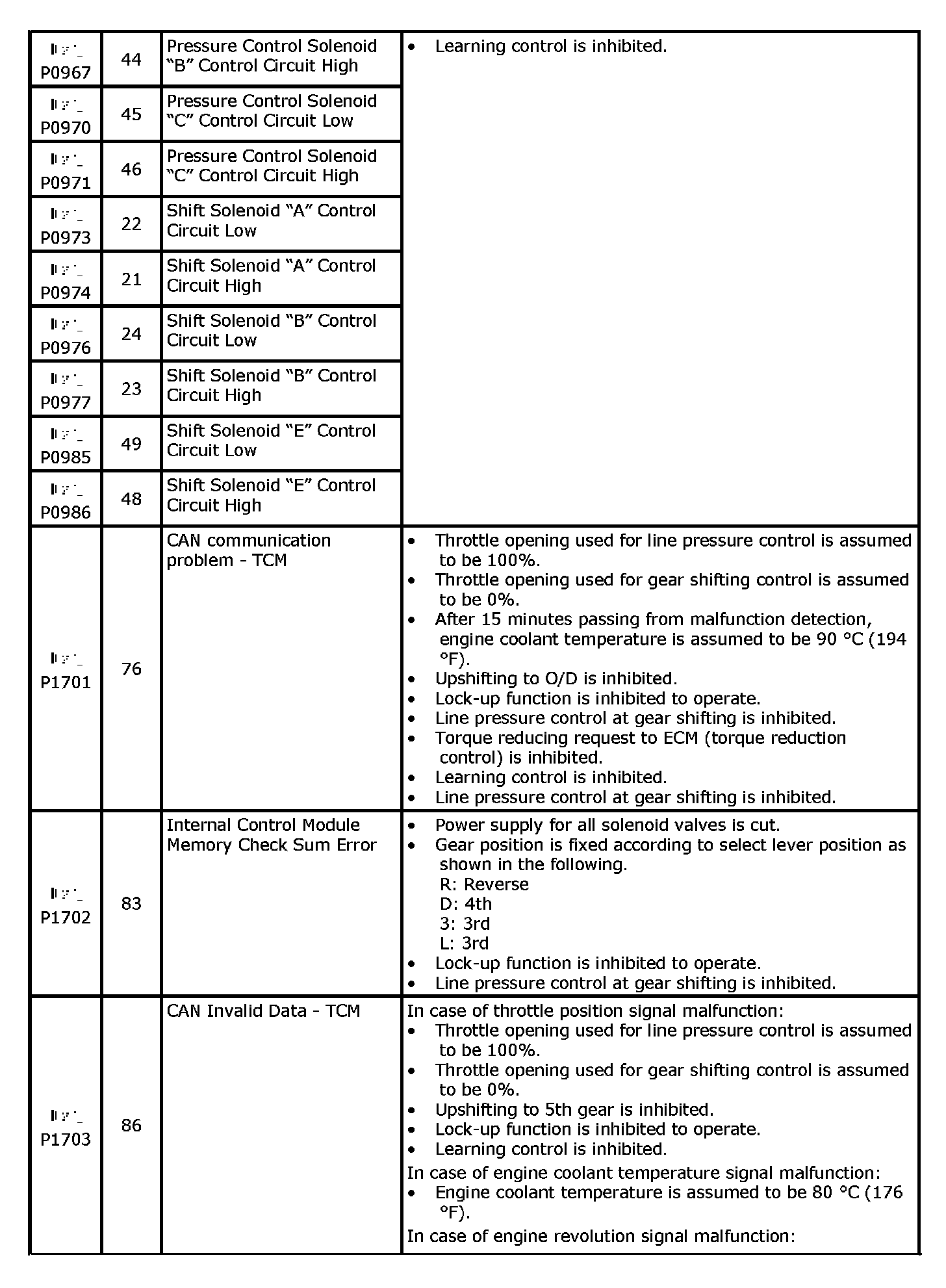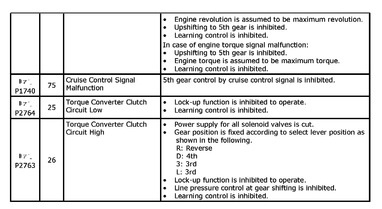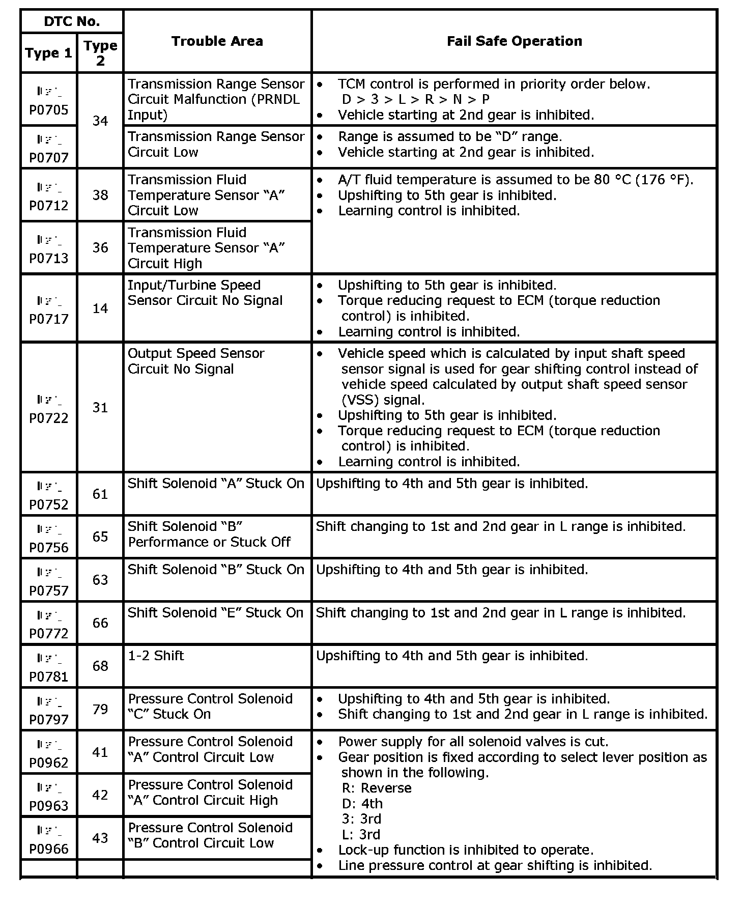 This function is provided by the safe mechanism that assures safe driveability even when the solenoid valve, sensor or its circuit fails. The following table shows the fail safe function for each fail condition of sensor, solenoid, TCM or its circuit.