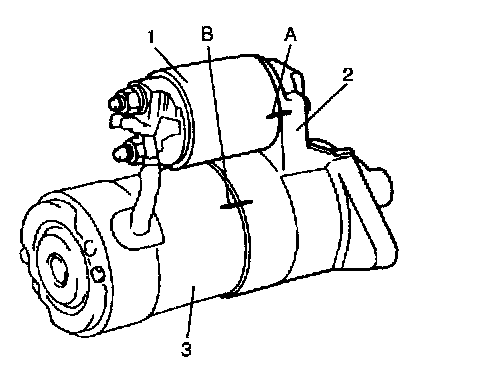 - Before disassembling starting motor, be sure to put match marks at 2 locations (A (magnetic clutch (1) and front housing (2)) and B (front housing (2) and yoke (3))) as shown in figure so that any possible mistake can be avoided.