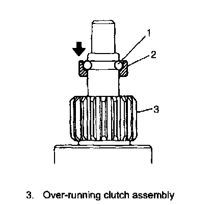 9. Install over-running clutch assembly (1) to gear shaft (4), using care for installing direction of pinion stop ring (2).