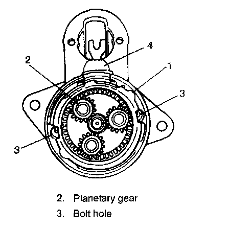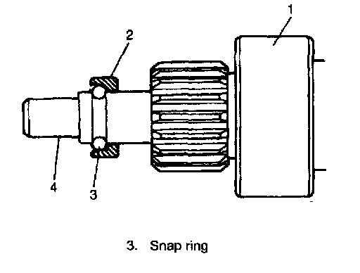 7. Remove snap ring (2), then pull out pinion stop ring (3) and over-running clutch (4) and internal gear (1).