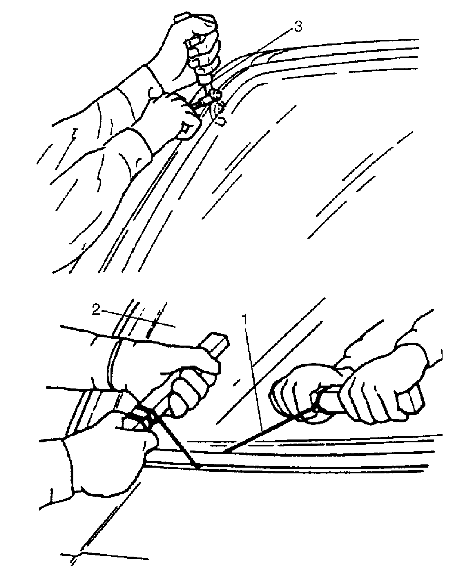 9. Cut adhesive all around windshield (2) with piano string (1). When using tool (windshield knife) (3) to cut adhesive, be careful not to cause damage to windshield (2). Use wire to cut adhesive along lower part of windshield.