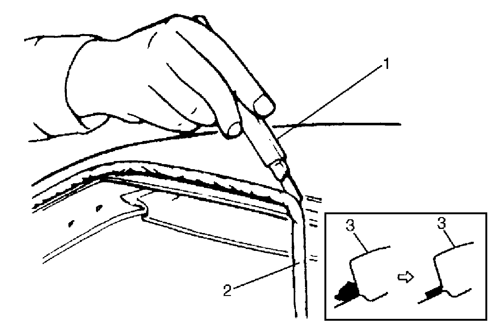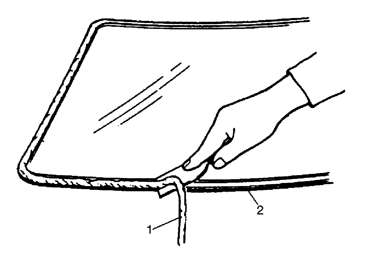 11. When reusing windshield, remove the adhesive (1) from it, using care not to damage primer coated surface (2).