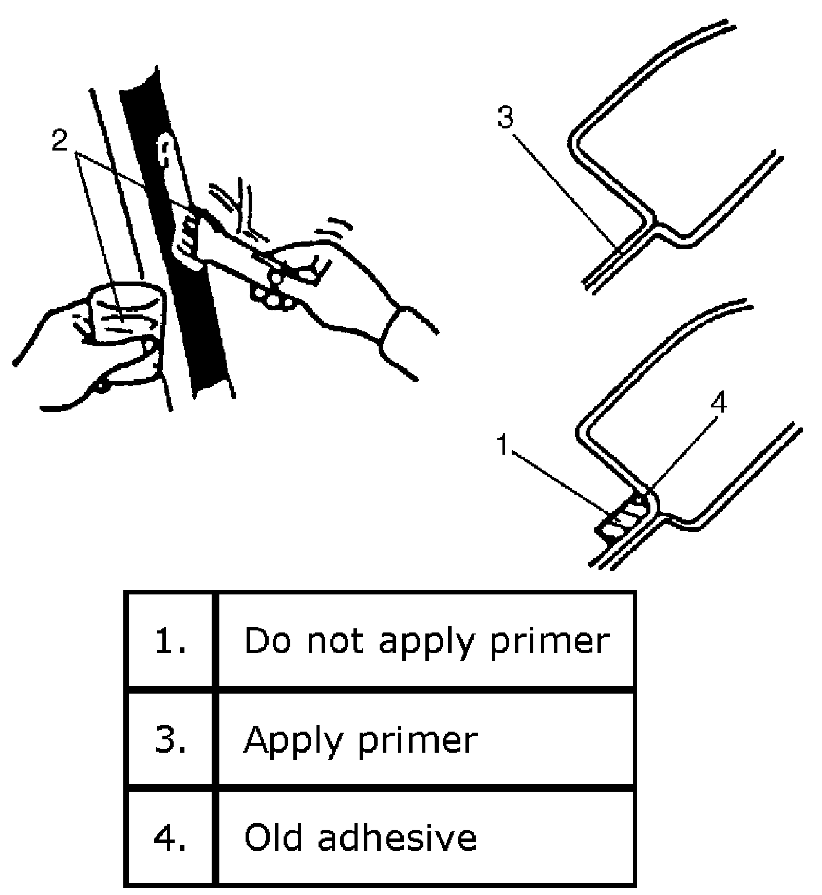 4. Clean contact surfaces of old adhesive, paint or bare metal thoroughly. If surfaces of paint or bare metal come out, apply primer (2) for body with caution not to apply primer to surface of adhesive remaining on body.