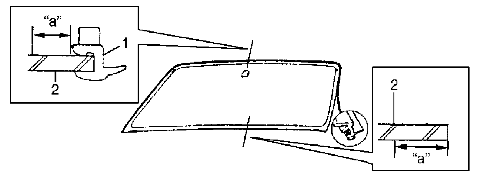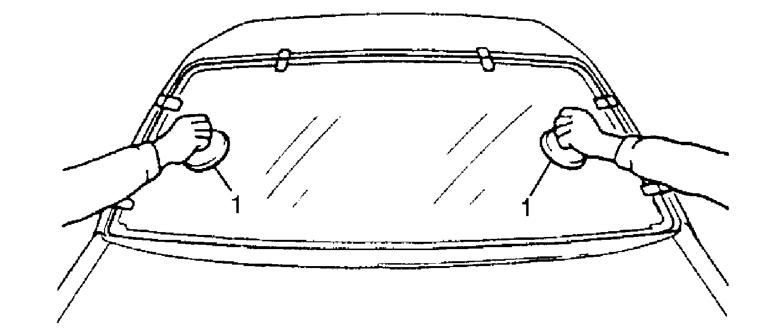 2. Install new glass stoppers (2 pcs) to lower side of windshield and new fastener (1) to body. When reusing windshield, install new fastener (1) to windshield.