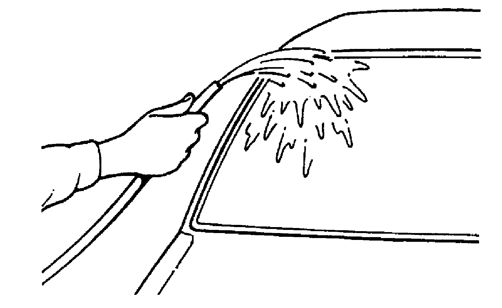 11. Check for water leakage by pouring water over windshield through hose. If leakage is found, dry windshield and fill leaky point with adhesive. If water still leaks even after that, remove glass and start installation procedure all over again.