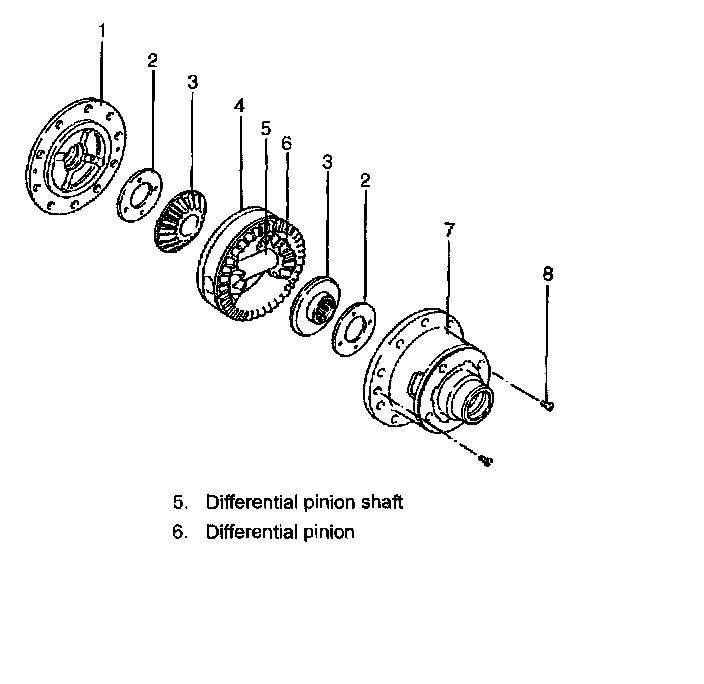 1. Install differential gears (3), free axle hub (4) and washers (2) to left case (7).