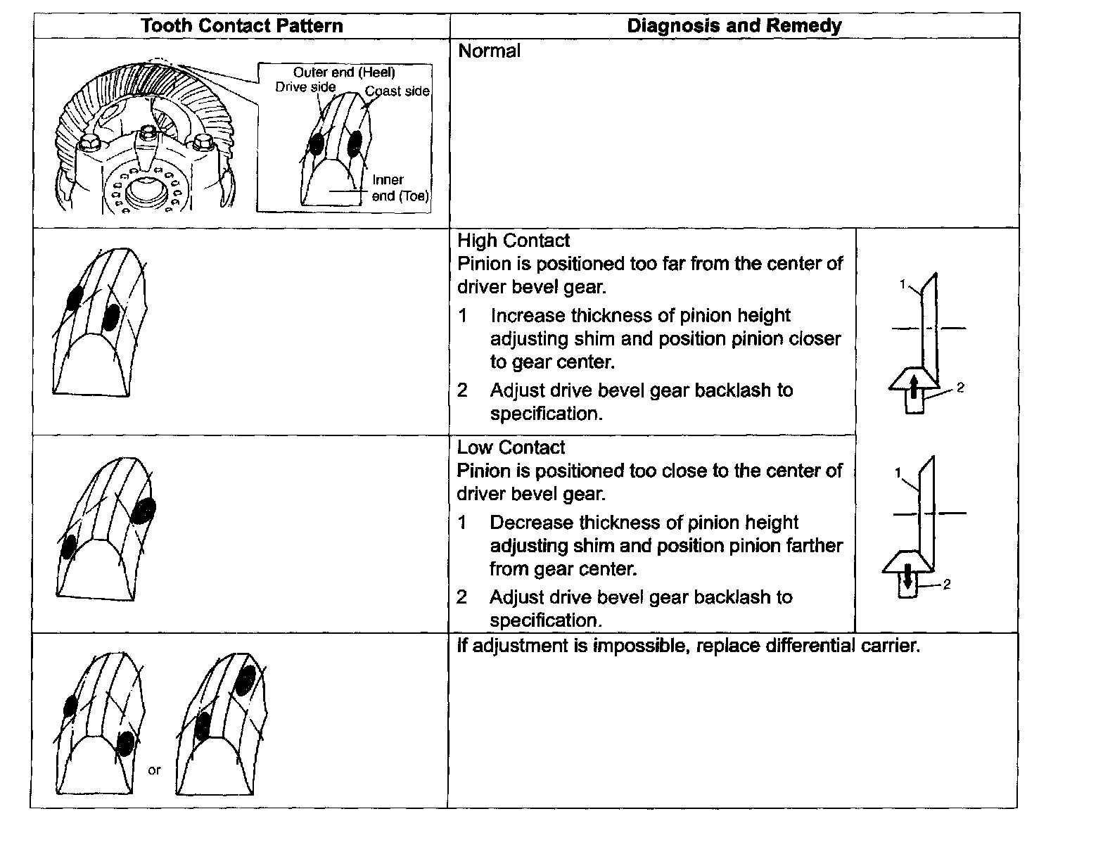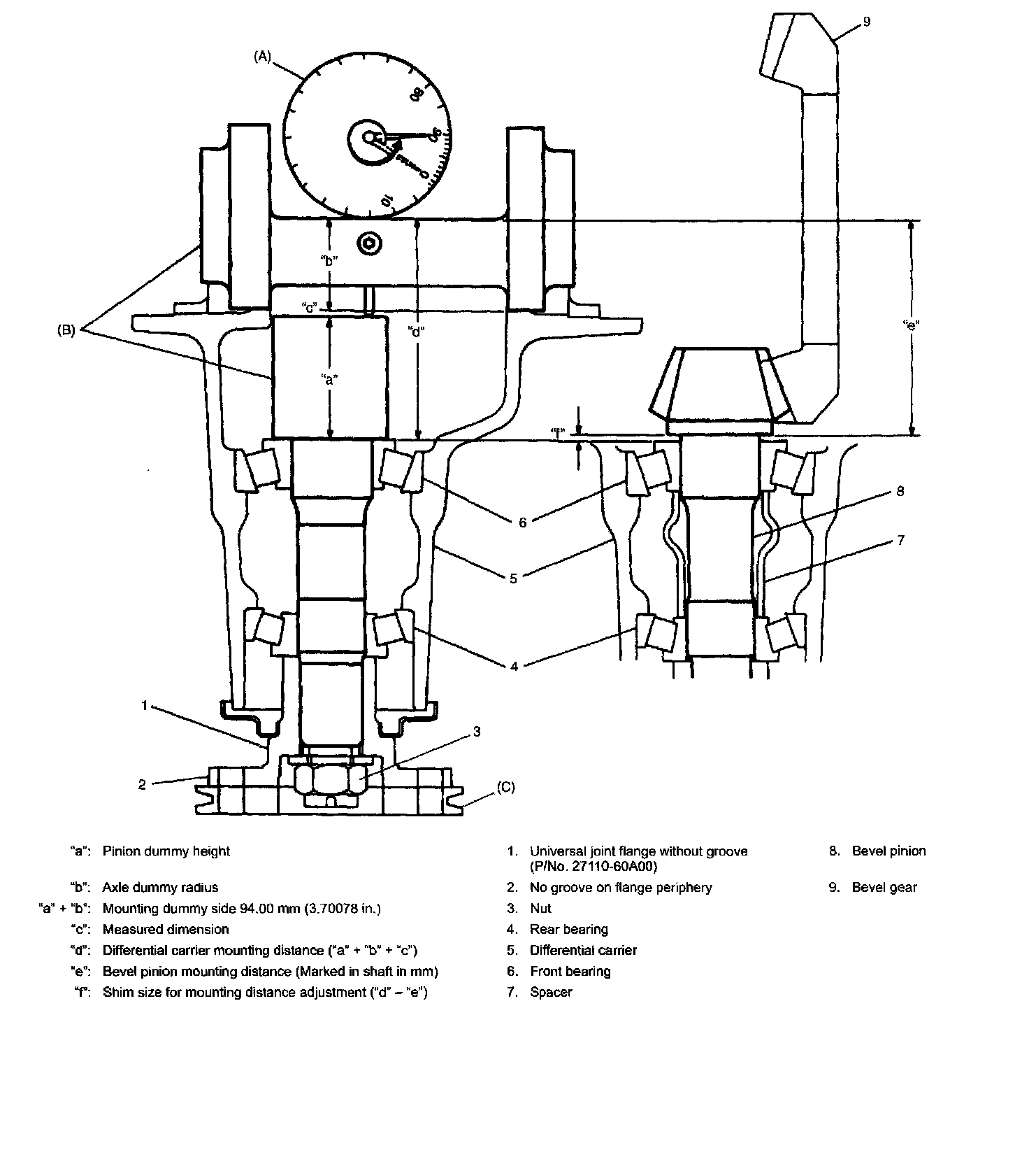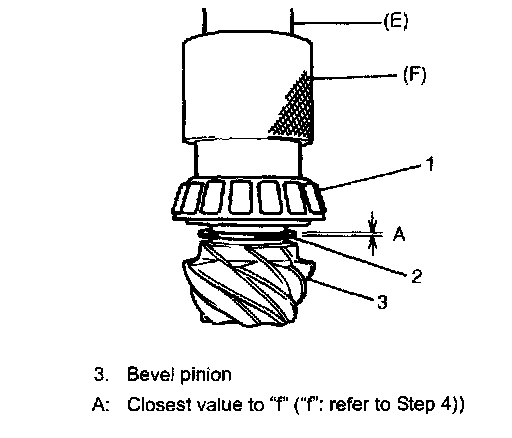 To engage bevel pinion and gear correctly, it is prerequired to install bevel pinion to differential carrier properly by using adjusting shim as described below. Shown in the figure of Step 4 are relative positions of bevel pinion, differential carrier and mounting dummy.