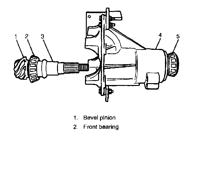6. With new pinion spacer (3) inserted as shown, install rear bearing (5) to differential carrier (4).