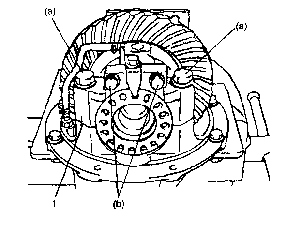 7. Tighten both bearing adjusters (1) so as to obtain specified gear backlash and at the same time, obtain preload of side bearing.