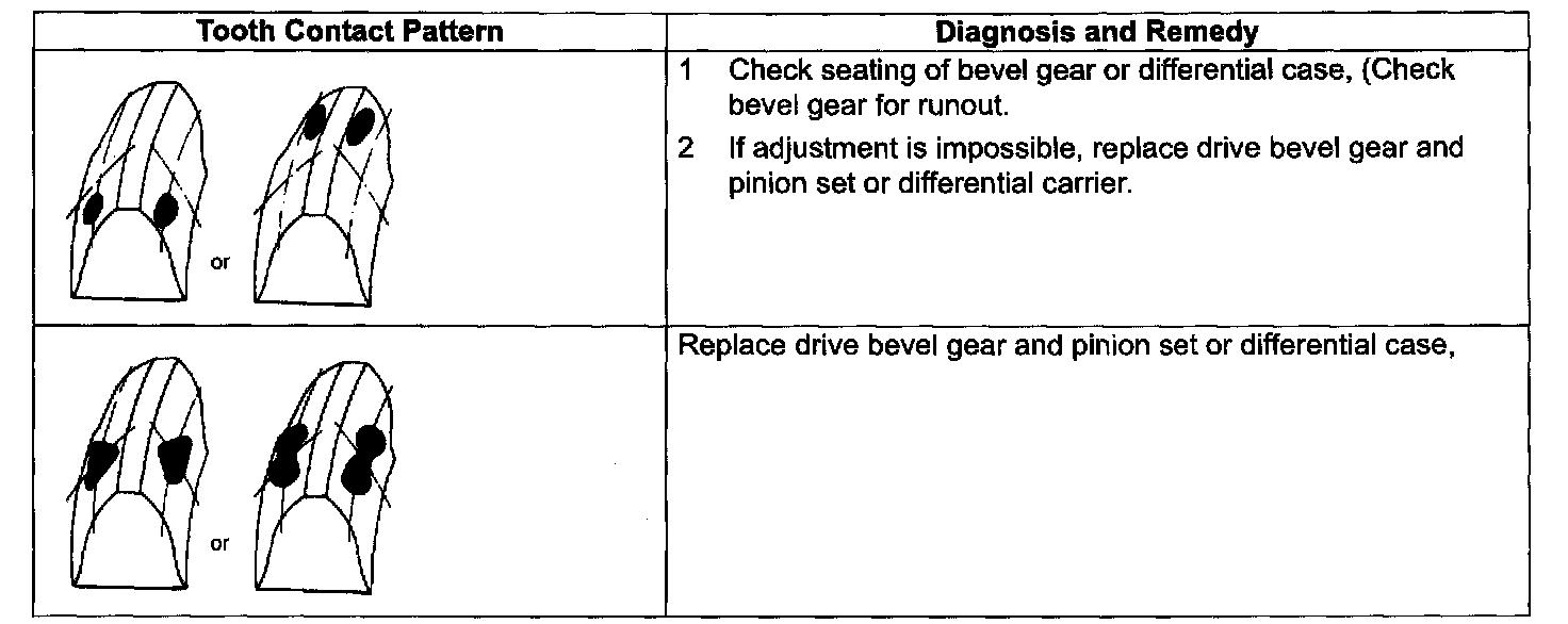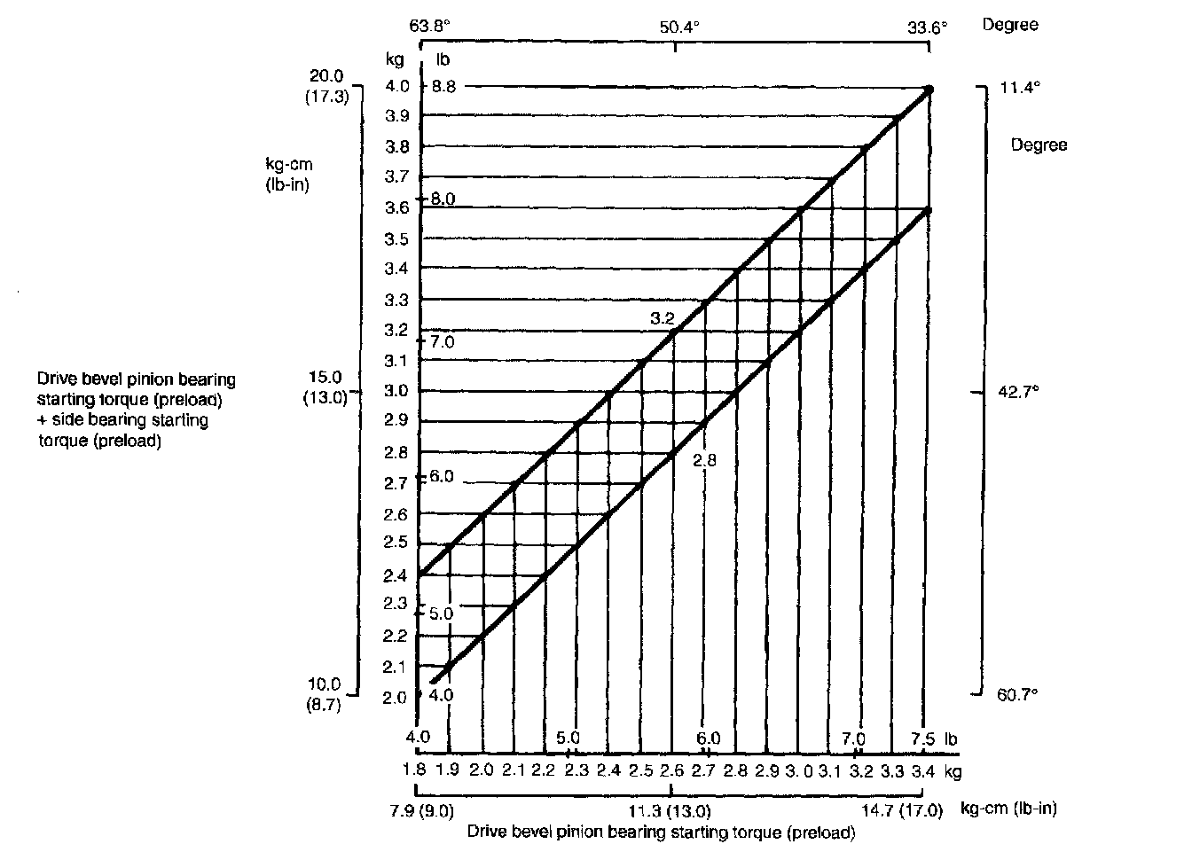 When preload of bevel pinion is 2.6 kgf/5.73 lbs., acceptable composite preload of both pinion bearings and side bearings should be between 2.8 and 3.2 kgf/6.17 and 7.05 lbs.