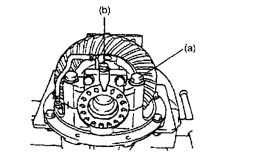 b. Turn gear to bring its painted part in mesh with bevel pinion and turn it back and forth by hand to repeat their contact.