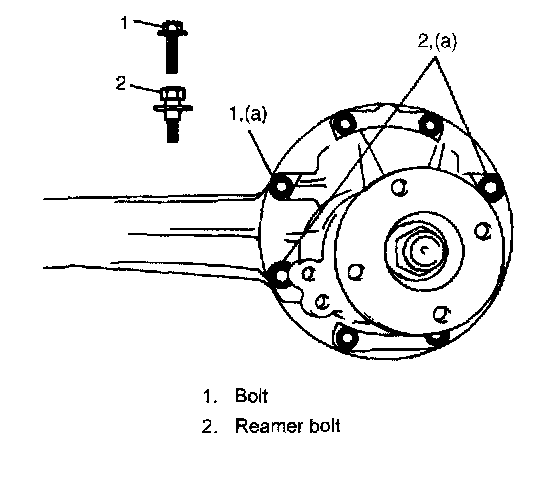 13. With differential assembly installed in housing, position it with 2 reamer bolts (2)and then install other 6 bolts (1).
