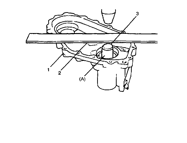 4. Using special tool and press, install needle bearing into rear case (1). As shown in the figure, apply straightedge (2) to case surface and press-fit till top (3) of special tool (A) aligns with bottom surface of straightedge (2) (i.e., case surface).