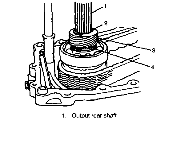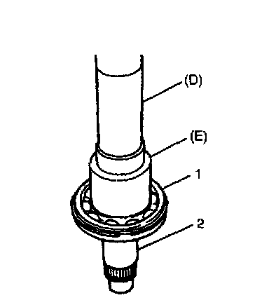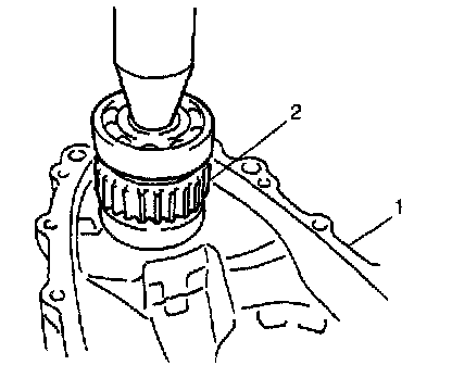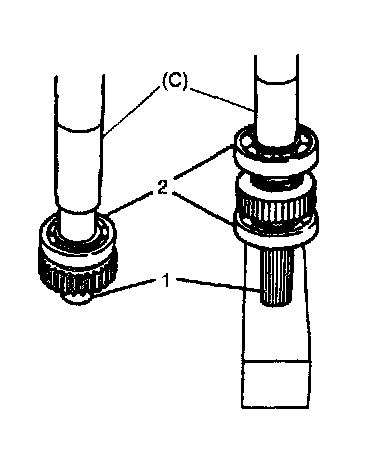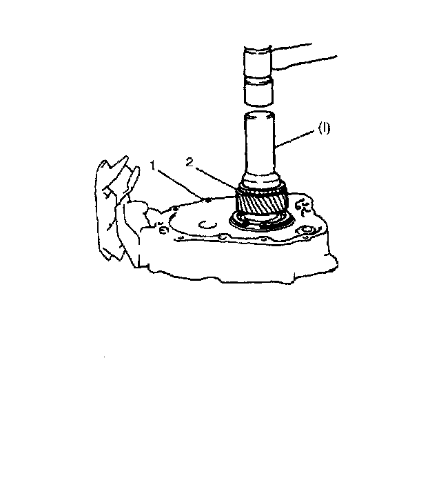 9. Using press and special tools, install bearing No. 1 (1) into output rear shaft (2). Place circlip portion of bearing on top as shown in figure.
