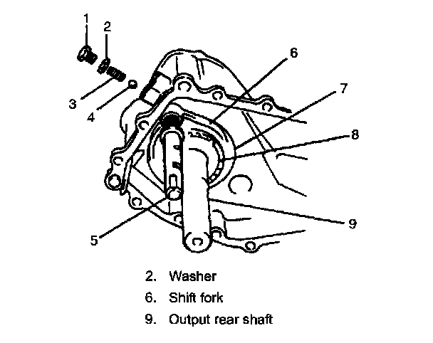 22. Combine sleeve (8) and hub to reduction shift shaft assembly (6) and install them into center case (9). Then put locating ball (4) and spring (3) also into case and loosely install bolt (1).