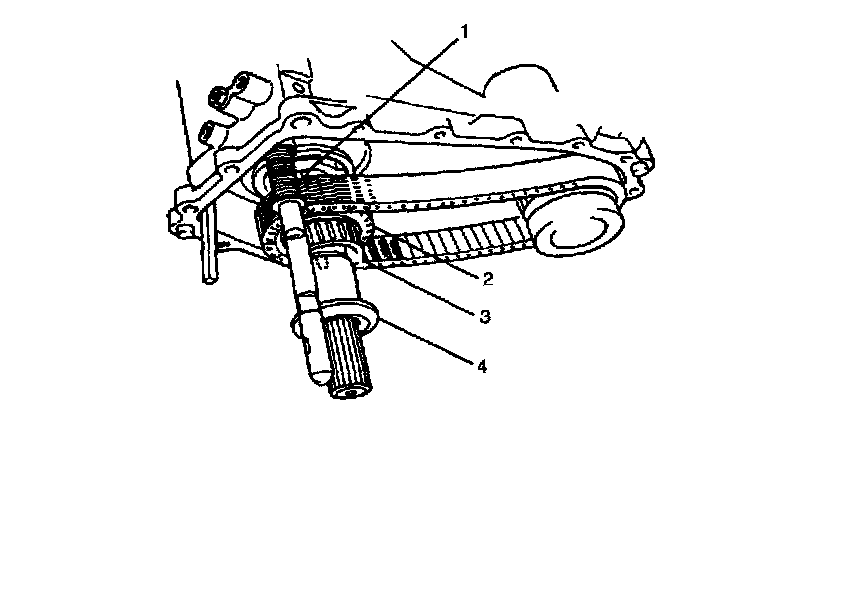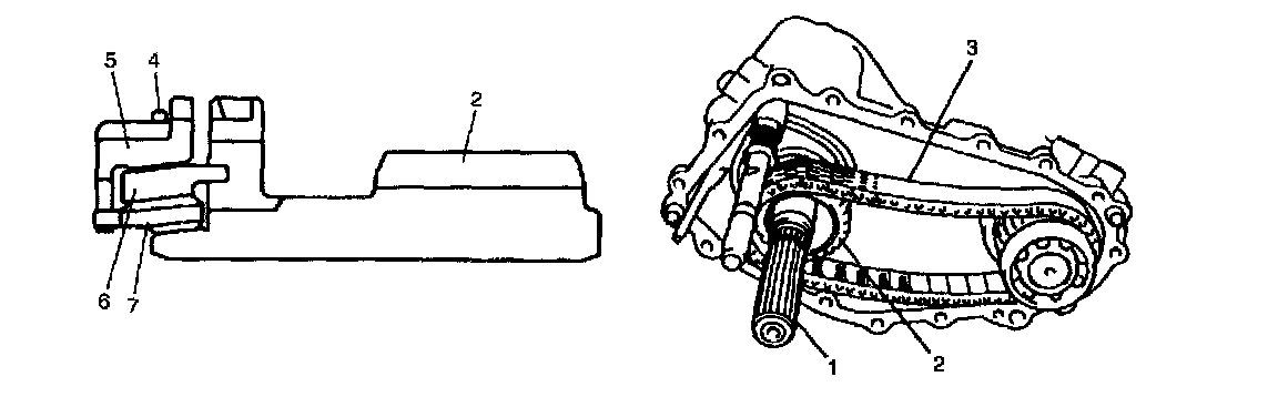 15. With the outer ring (5), spring (4) (if equipped), cone (6) and the inner ring (7) put together and installed to sprocket gear (2) as shown in the figure, install them together with chain (3) to output rear shaft (1).