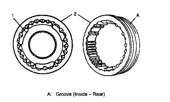 13. Fit sleeve to front drive clutch hub (1), place 3 synchronizer keys (4) (if equipped) in it and then set synchronizer springs (3) (if equipped). When installing, note that front drive clutch hub (1) and sleeve (2) have specific installing direction.