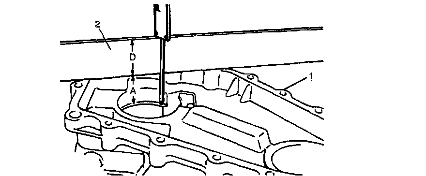 a. Measure rear case (1) dimension "A" (from mating surface to bearing bore bottom) by using straightedge (2) and vernier caliper. Width of straightedge "D" plus "A" is obtained.