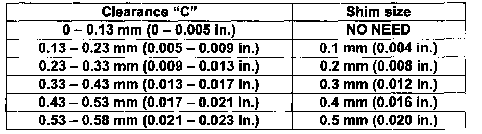 CAUTION: Installing of over sized shim beyond specification in the following table may cause tight rotation of rear shaft and consequential bearing damage.
