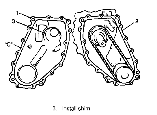 37. Clean mating surfaces of both center (2) and rear (1) cases again, apply sealant "C" to mating surface of rear case, and put them together.