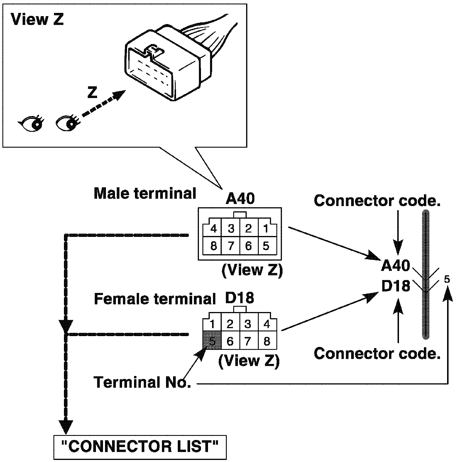 - The connector shape and terminal layout shown are those when viewed from "Z" in the illustration