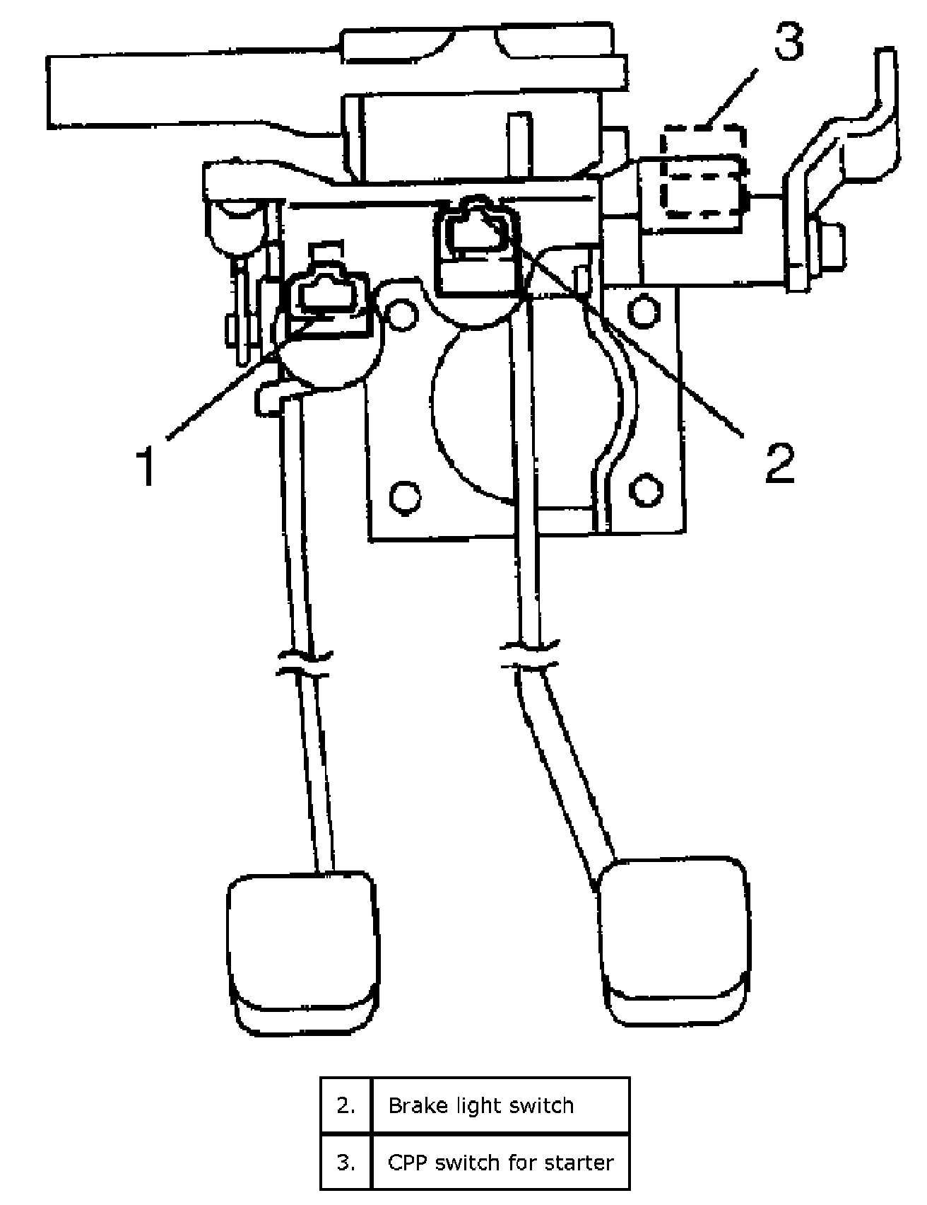 1. Install CPP switch (for cruise control) (2) to pedal bracket.