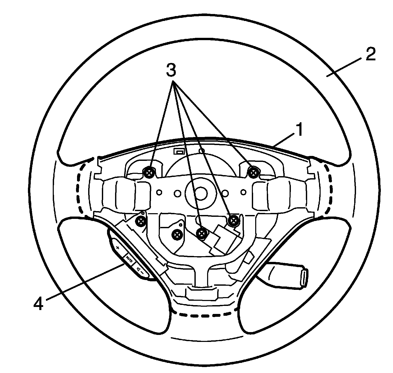 3. Remove audio control switch (if equipped) (4) from steering wheel (2).