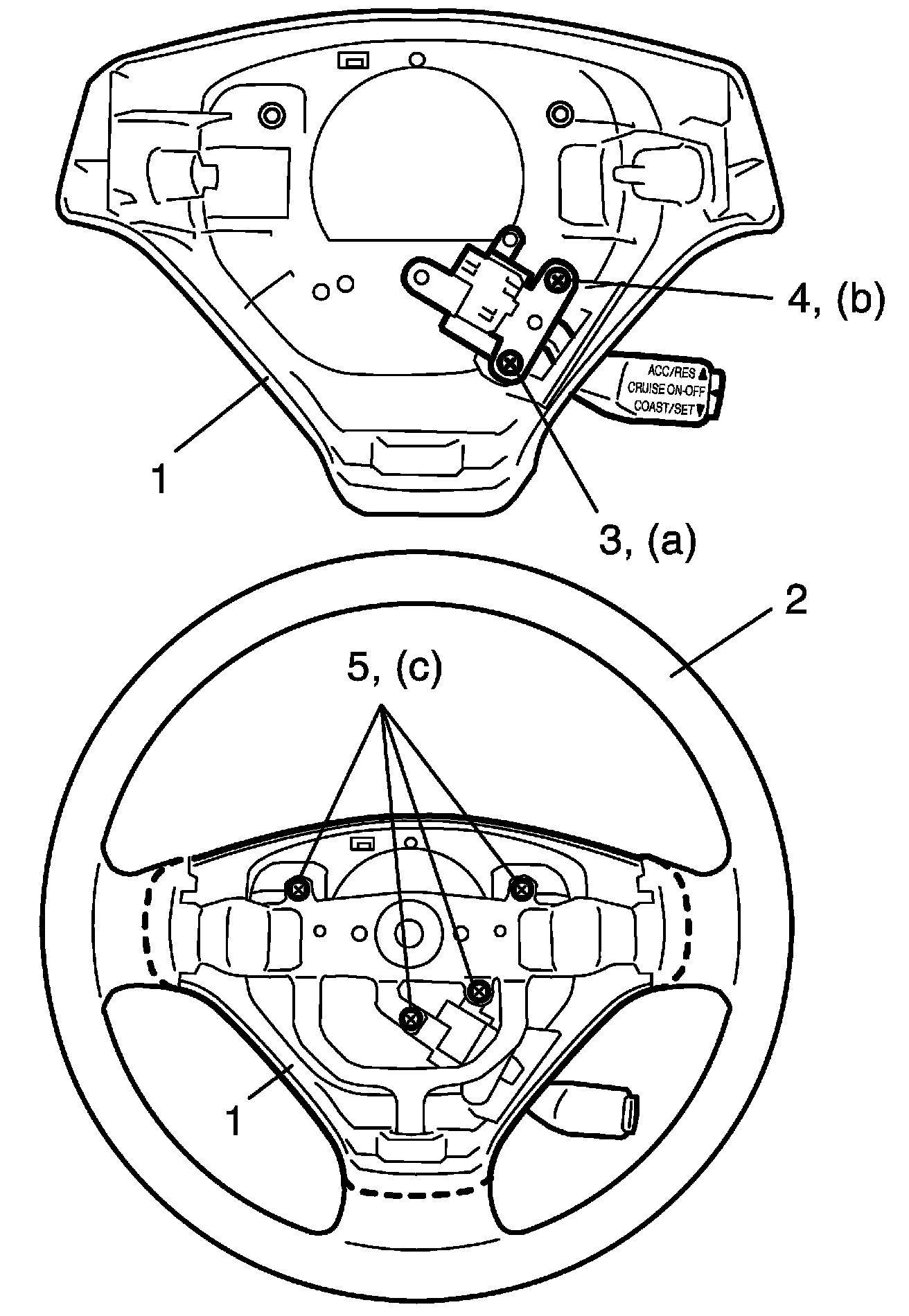 - Tighten cruise control switch assembly bolt (3), cruise control switch assembly screw (4) and steering wheel lower cover screws as specified torque.