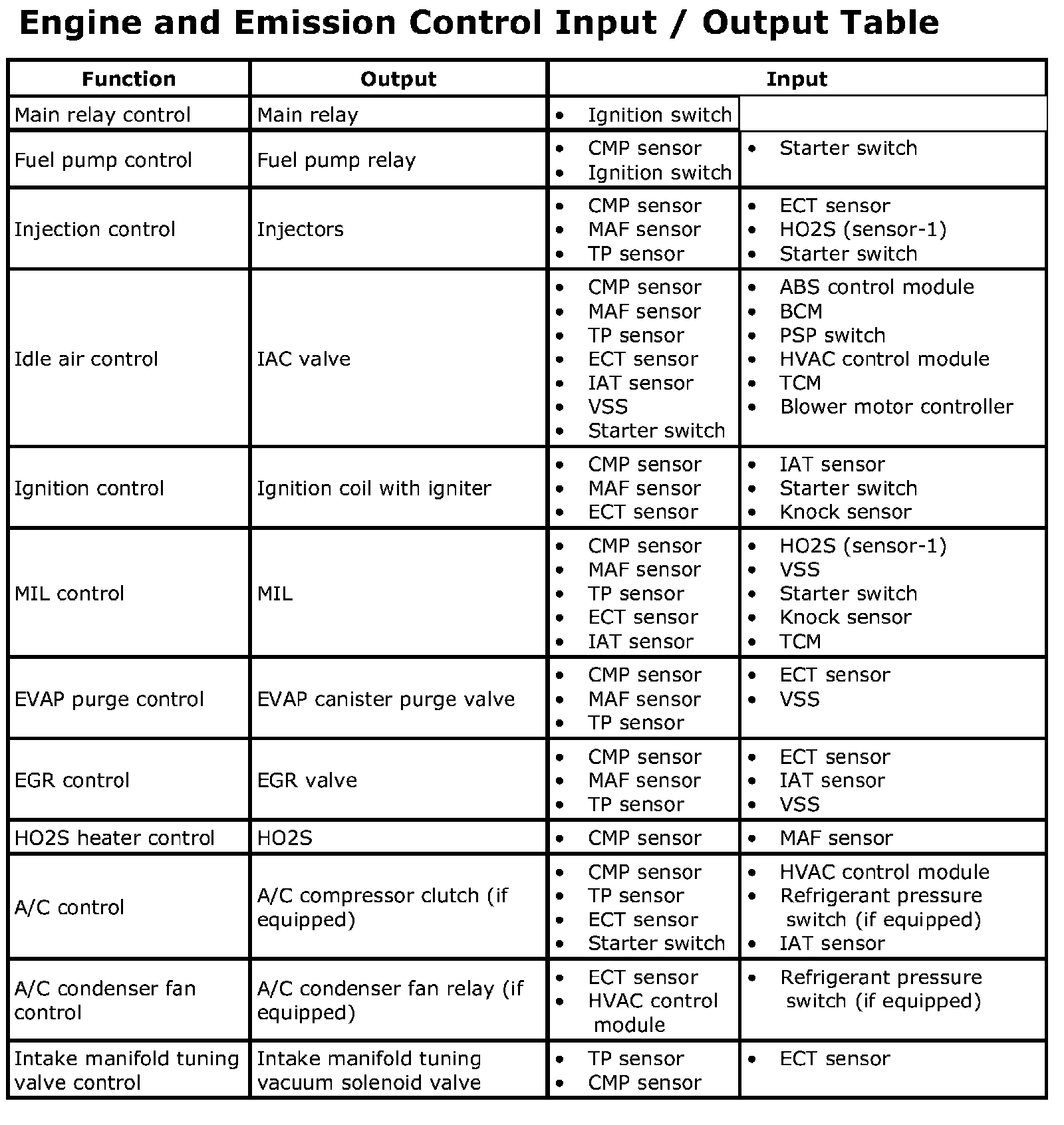 Engine And Emission Control Input / Output Table: