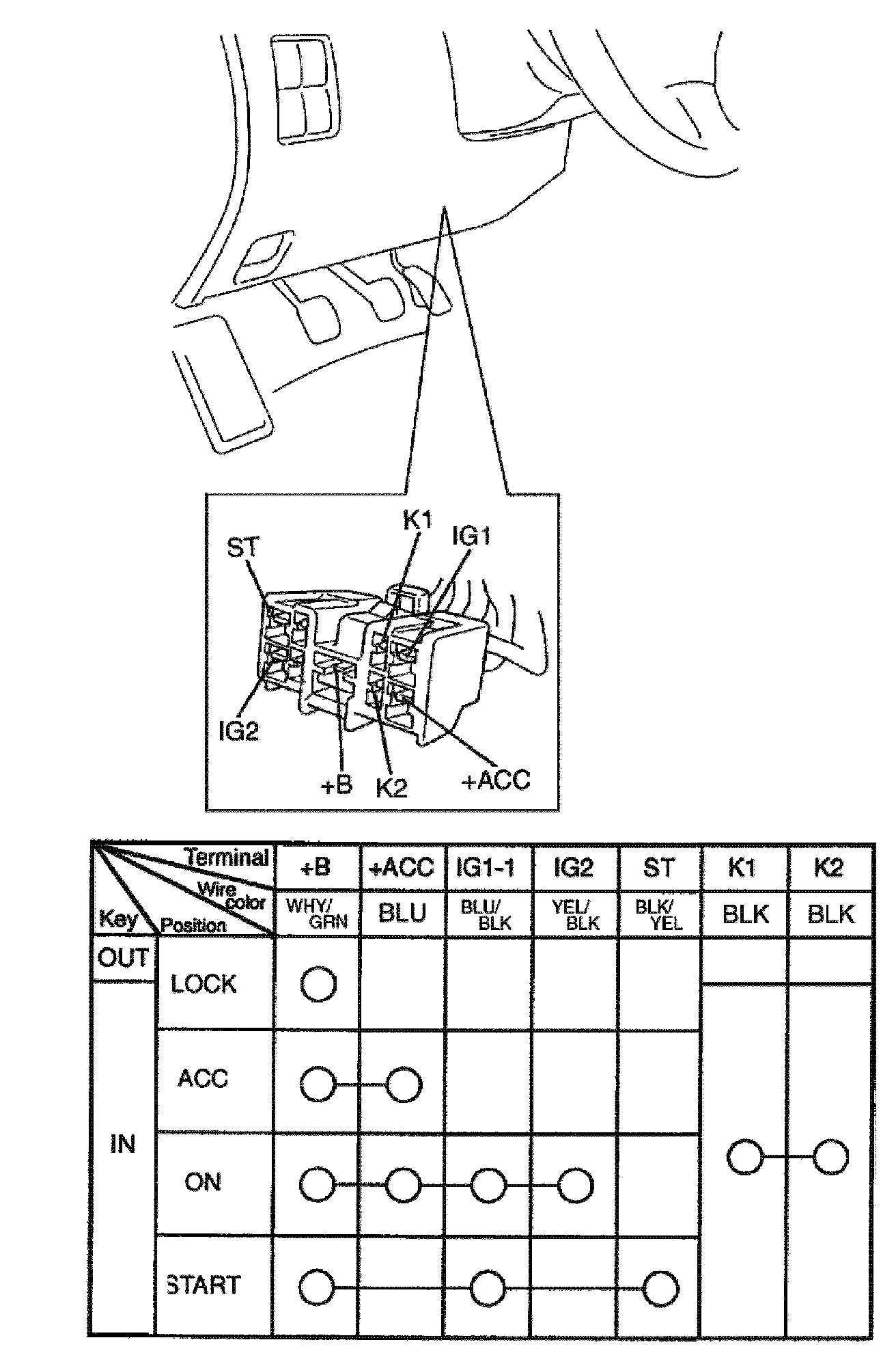 4. Check continuity between terminals. Use circuit tester to check continuity at each switch position. If continuity is not obtained according to the table below, replace ignition (main) switch.