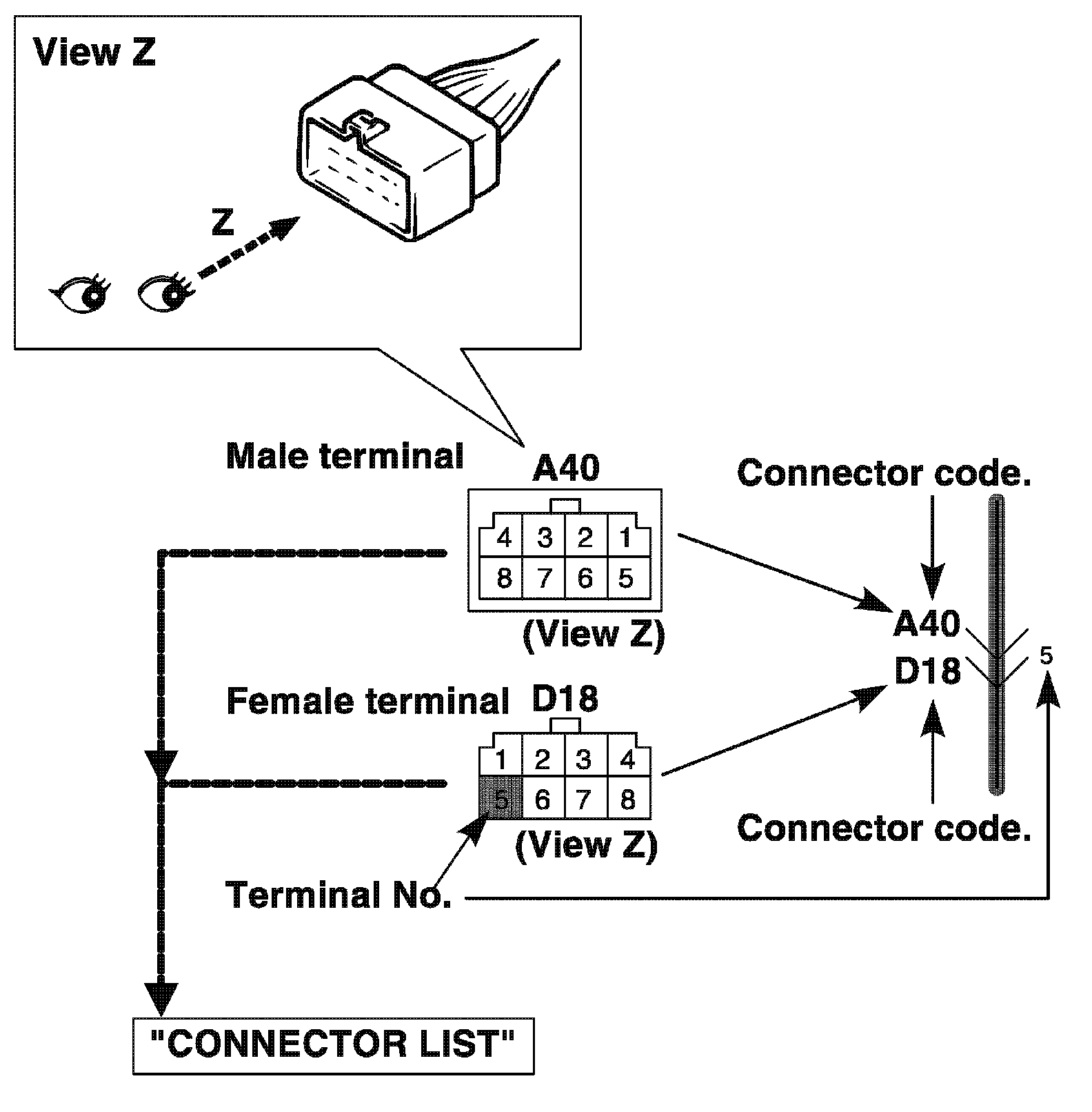 5. Connector location, shape and terminal No.