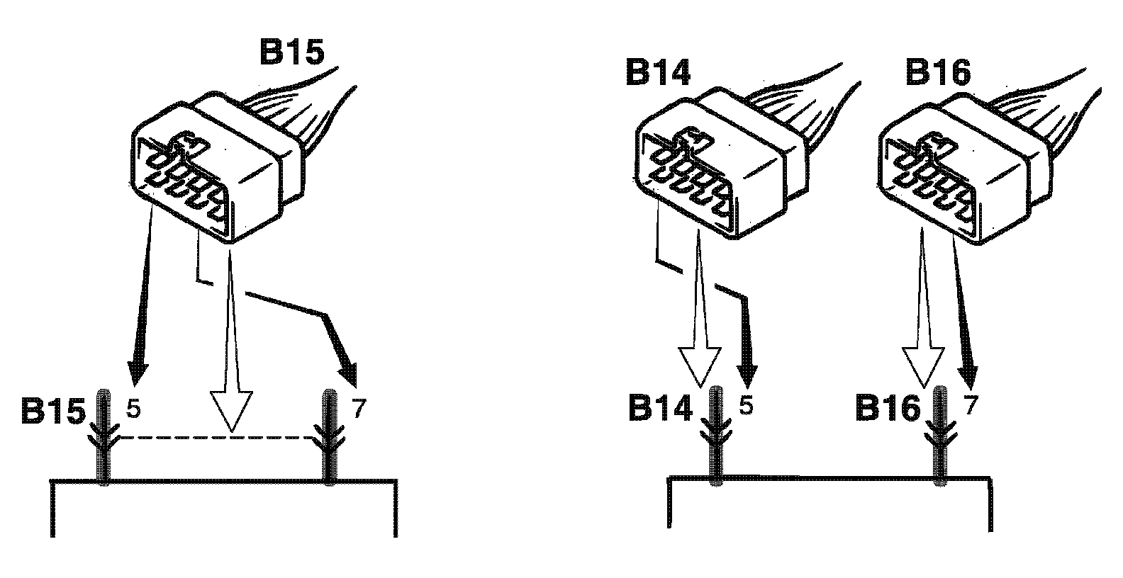 3. Terminals in one connector (Broken line) (B15)/Terminals in different connectors (B14,B16)