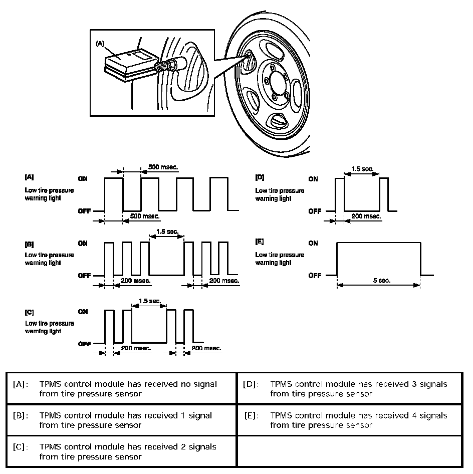 - If each ID code of 4 tire pressure sensors is not registered in BCM within 90 seconds, start all over from Step 1). Also, it is possible to check the number of ID codes of tire pressure sensors received by BCM by observing the flashing pattern of the low tire pressure warning light.