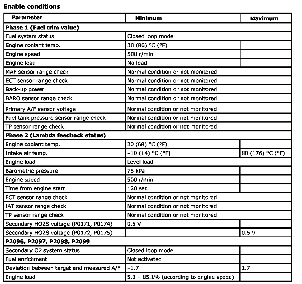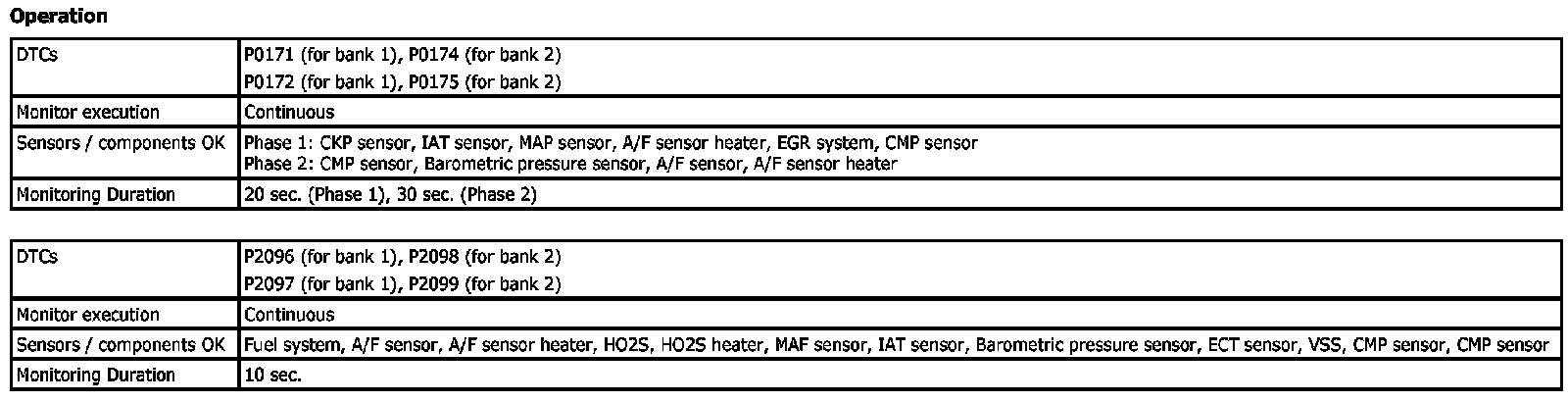 The ECM monitors the A/F sensor A/F characteristic offset by monitoring the feedback condition of O2 sensor. When the sum of correction factor of O2 sensor system excess higher or lower value, the ECM will set DTC.