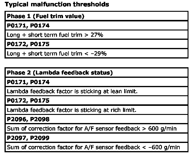 As fuel system components age or otherwise change over the life of the vehicle, the adaptive fuel strategy learns deviations from stoichiometry while running in closed loop fuel. These learned corrections are stored in keep alive memory as long term fuel trim corrections. They may be stored continue to change beyond normal limits or if a malfunction occurs, the long term fuel trim values will reach a calibratable rich or lean limit where the adaptive fuel strategy is no longer allowed to compensate for additional fuel system changes. Long term fuel trim corrections at their limits, in conjunction with a calibratable deviation in short term fuel trim, indicate a rich or lean fuel system malfunction.
