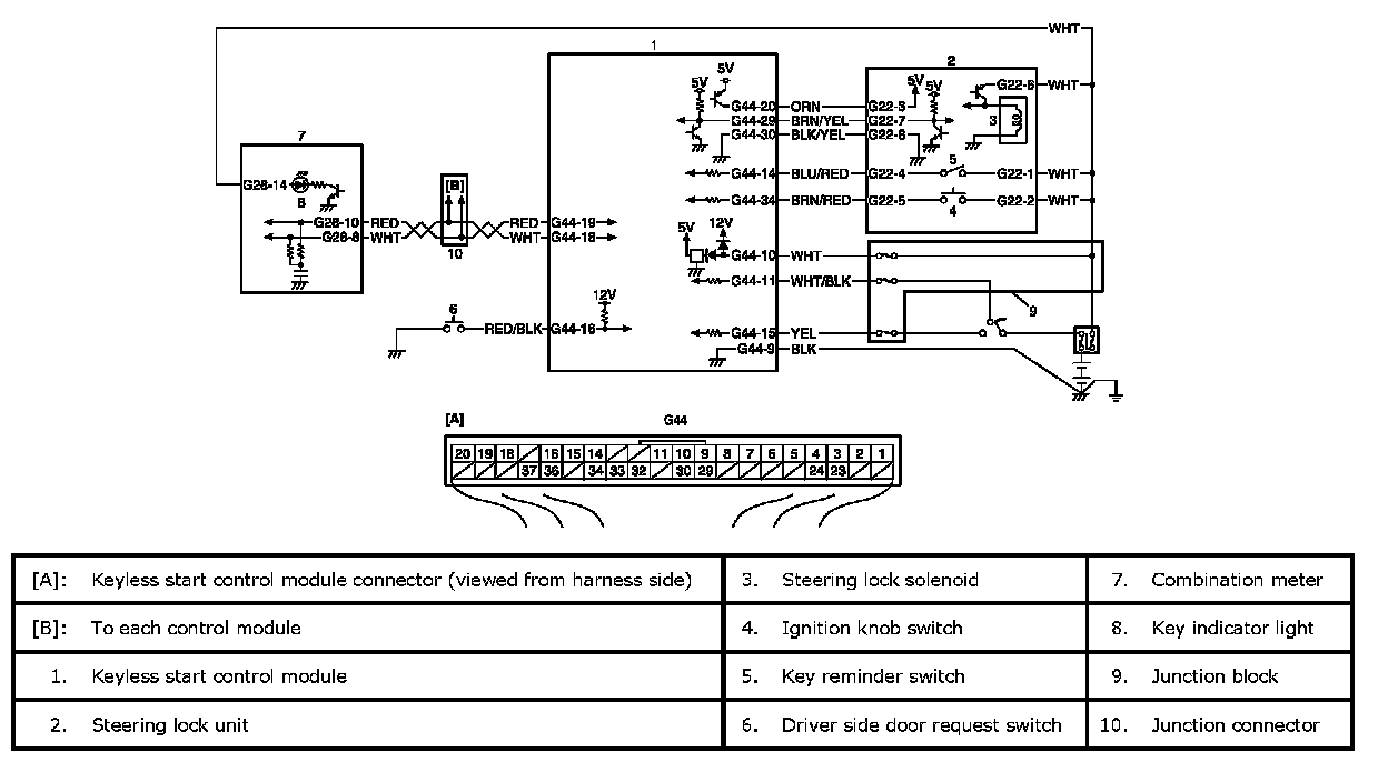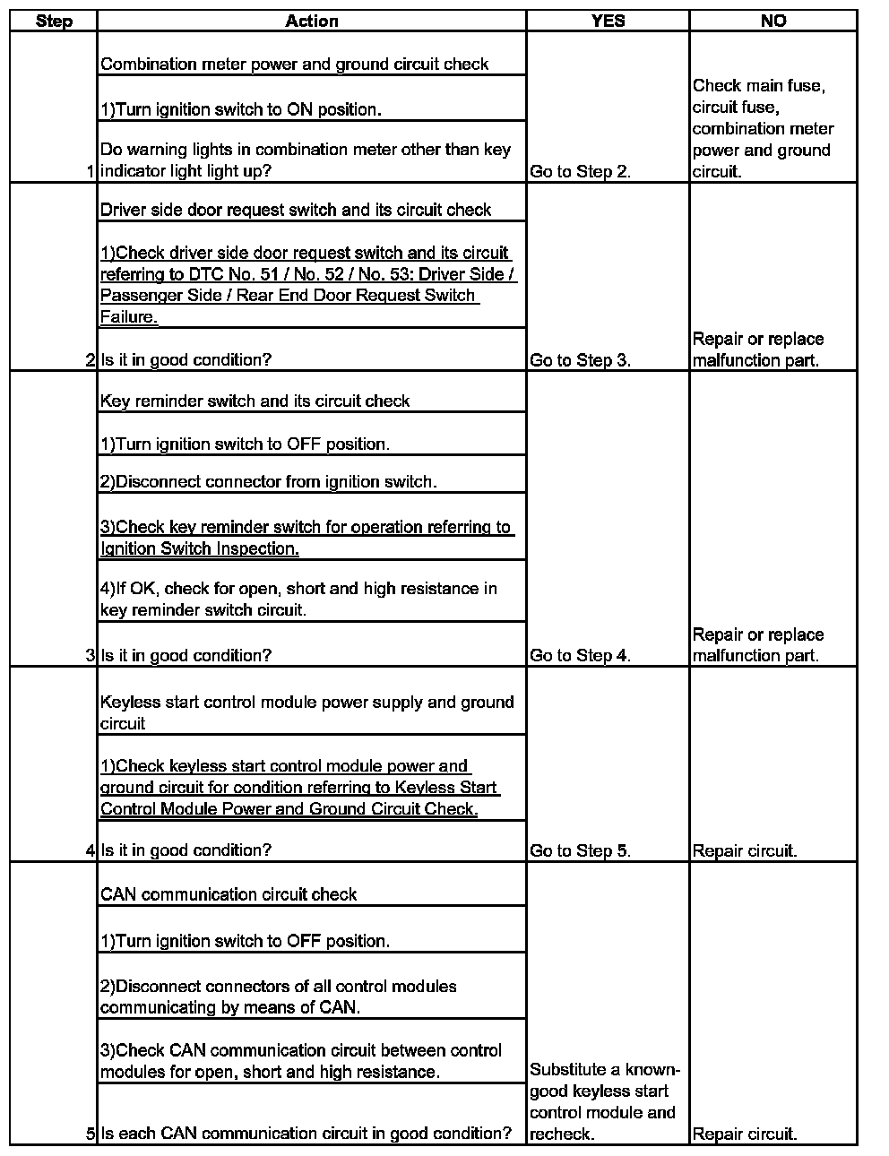 The keyless start control module detects DTC by using signals from the key reminder and driver side door request switches. The keyless start control module makes the key indicator light in the combination meter flash on and off by using CAN communication.