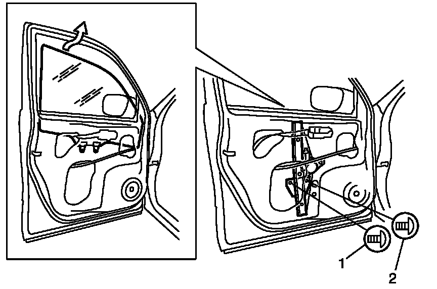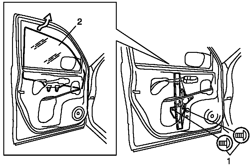 - Tighten door glass rear mounting screw (1) first, and then tighten door glass front mounting screw (2).
