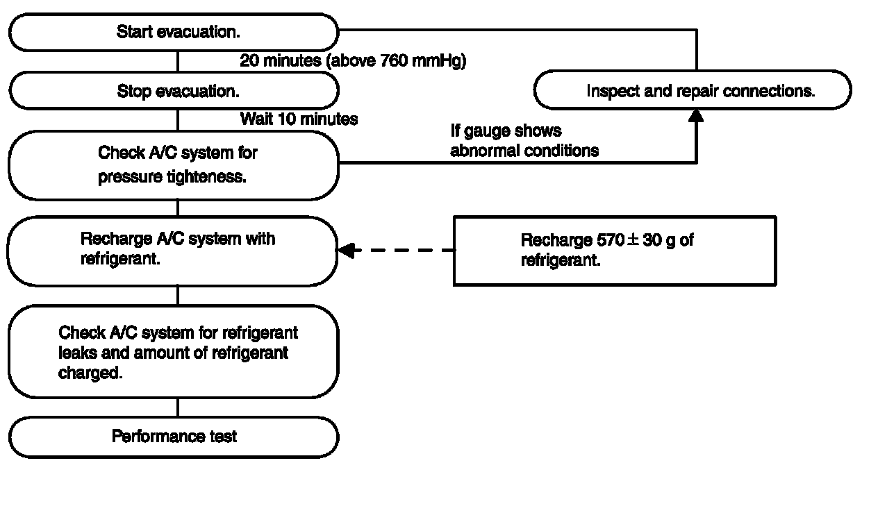 NOTE: Once A/C system circuit is opened (exposed to atmospheric air) air conditioning system must be evacuated by using a vacuum pump. The A/C system should be attached with a manifold gauge set, and should be evacuated for approx. 20 minutes.