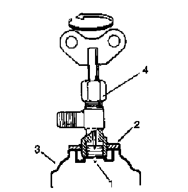 i. Retract needle (1) and remove refrigerant container tap valve (4) by loosening its plate nut (2).