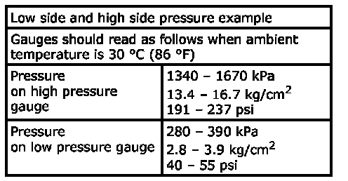 8. After the system has been charged with specified amount (570 ± 30 g) of refrigerant or when low pressure gauge and high pressure gauge have indicated the following specified value, close low pressure side valve on manifold gauge set. Low side and high side pressure example Gauges should read as follows when ambient