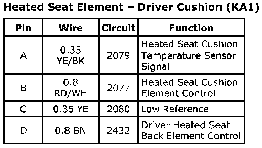 Heated Seat Element - Driver Back (KA1)Connector Part Information