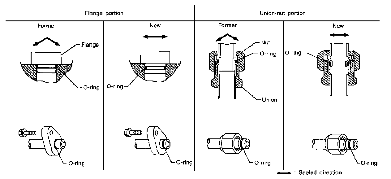 - The O-ring has been relocated. It has also been provided with a groove for proper installation. This reduces the possibility of the O-ring being caught in, or damaged by, the mating part. The sealing direction of the O-ring is now set vertically in relation to the contacting surface of the mating part to improve sealing characteristics.