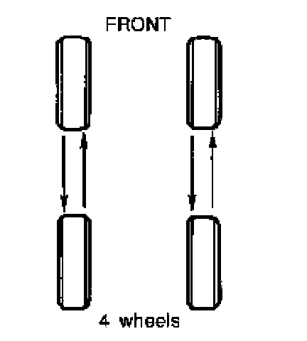 2) Rotate wheels and tires on each side from front to back as shown. Do not include the spare wheel and tire when rotating the wheels and tires.