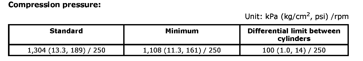 ^ If compression pressure is below minimum value, check valve clearances and parts associated with combustion chamber (valve, valve seat, piston, piston ring, cylinder bore, cylinder head, cylinder head gasket). After the checking, measure the compression pressure again.