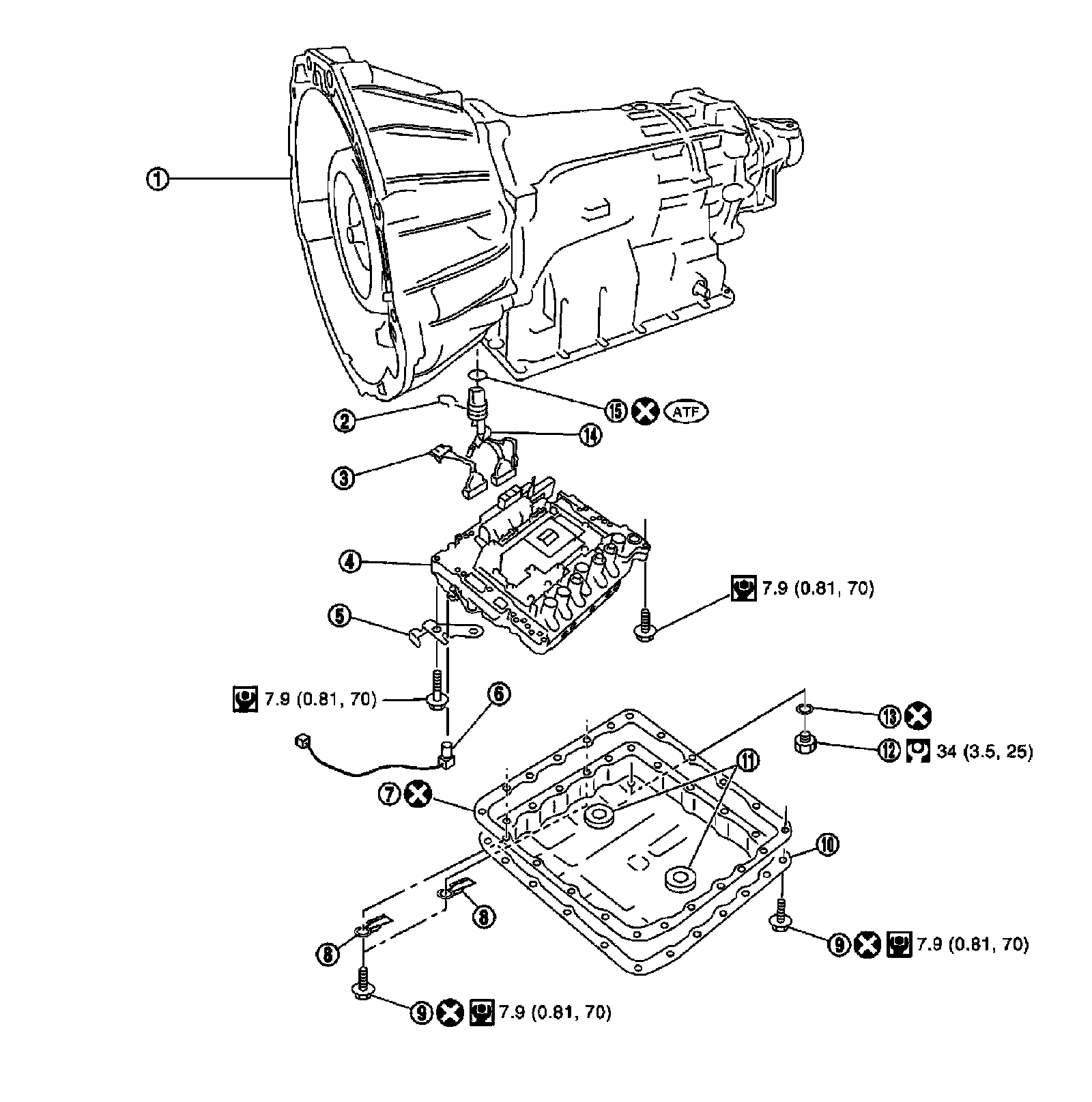 18) Refill the A/T with fluid and check the fluid level and for fluid leakage.