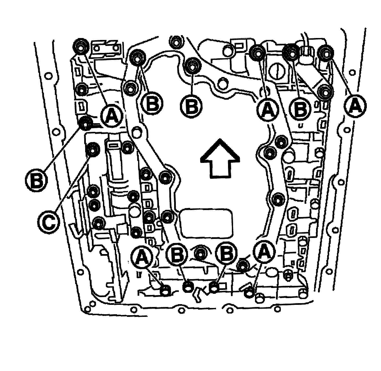 11) Remove bolts (A), (B) and (C) from control valve with TCM.