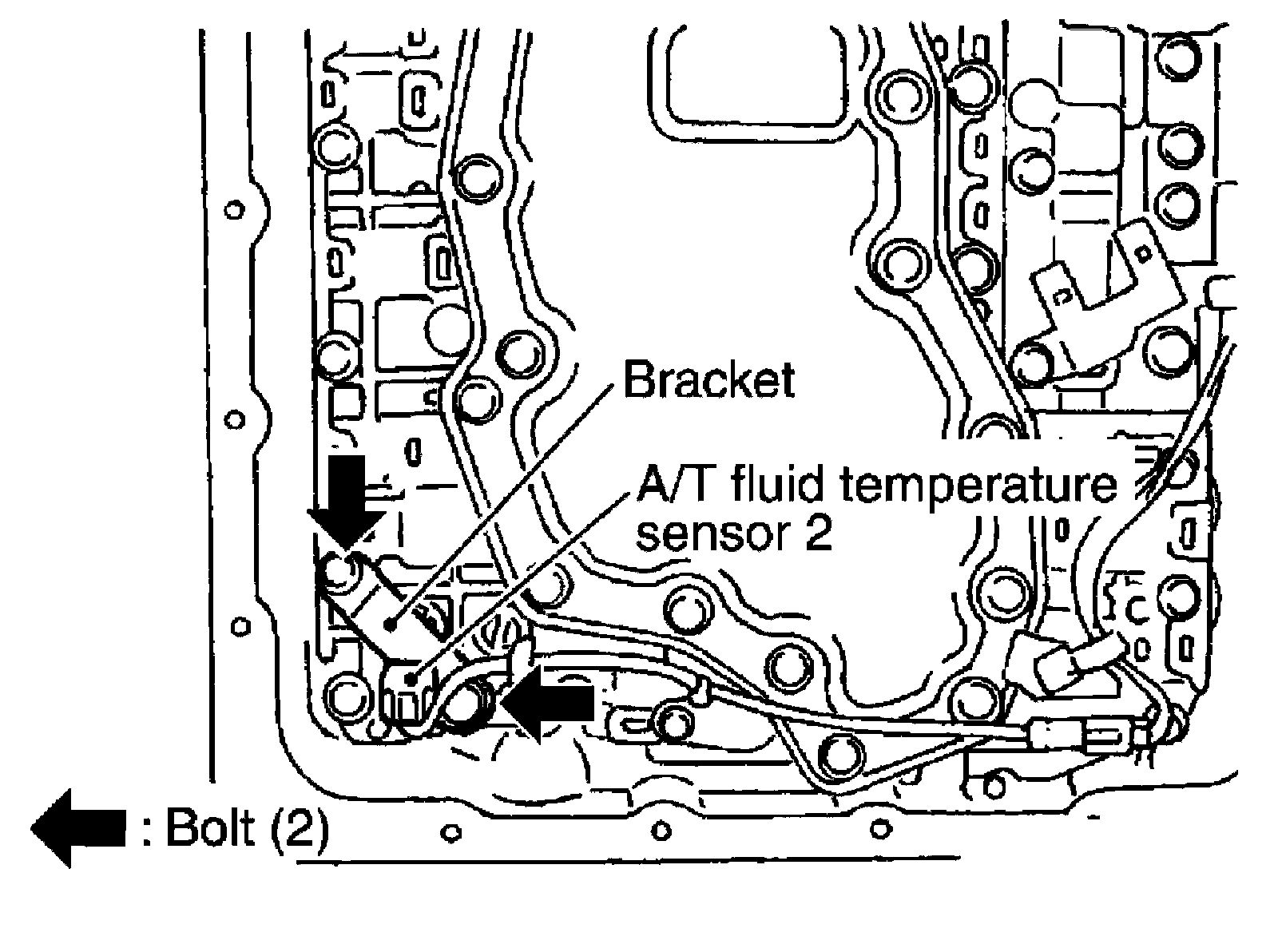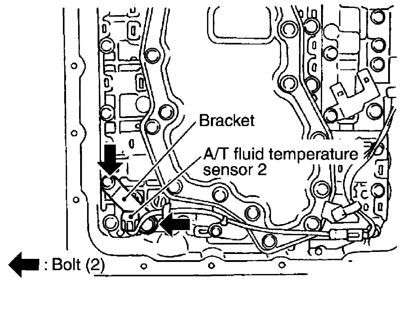 6) Install A/T fluid temperature sensor 2 (with bracket) to control valve with TCM. Tighten A/T fluid temperature sensor 2 bolt to the specified torque.